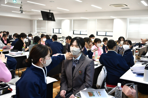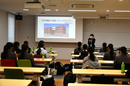 中村学園女子高校キャンパスツアーを実施 イベント 2025.12.19 12月17日、高大連携の取り組みの一環として、中村学園女子高校の生徒さんが本学へキャンパスツアーに来学されました。 本学2年生と一緒に「成人・高齢者看護演習」を体験した後、学内施設を見学。 参加された皆さん、大学の雰囲気を感じ取っていただけましたか? 次回は、来年夏のオープンキャンパスでお会いできることを楽しみにしています!